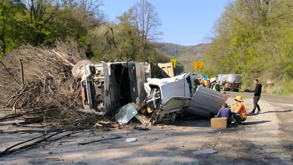 Közlekedési baleset történt az Ürögi hágón, amikor egy teherautó nekiütközött egy parkoló kisbusznak, majd felborult.